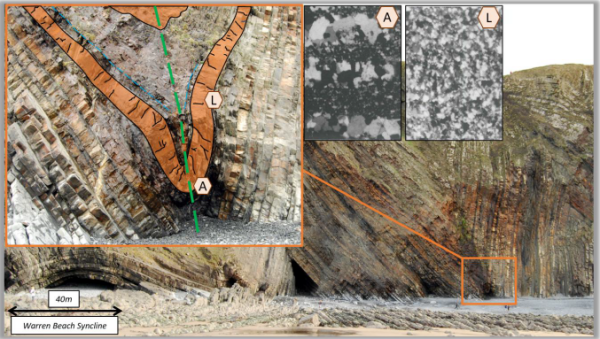 The latter phenomenon is achieved due to the extreme rates of burial soon after burial along with the high pressure & temperatures experienced by the sandstones during folding. Two photomicrographs (right image insets), showing the sandstone grain structure from the fold axis (A) and fold limb (L), record the process of quartz grain dissolution and remigration from areas of high pressure (fold limb: L) to reprecipitation in areas of low pressure (fold axis: A). In photomicrograph A the large white-light grey banded grains are the quartz reprecipitated from solution, whereas in photomicrograph L such grain sizes are absent, instead showing elongation and flattening as the remaining grains are deformed.