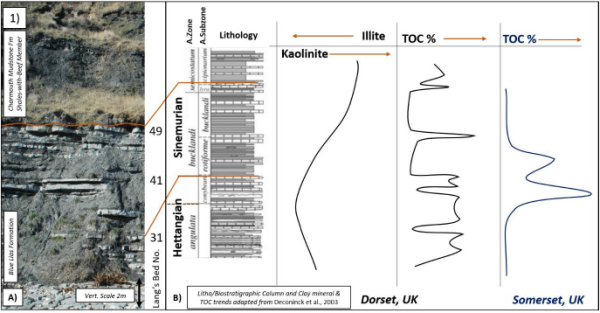 At Lyme Regis (as opposed to other Blue Lias outcrop locations - see image 1B) the Blue Lias Formation TOC profile does not hold any stratigraphic relationship. This is believed to result from the condensed nature of the section twinned with diagenetic carbonate cement overprinting the primary link between organic matter and clay mineralogy.