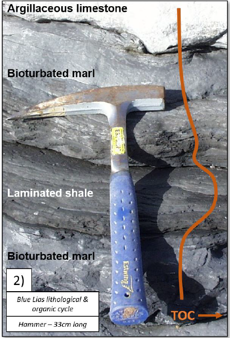 The Blue Lias Formation at Lyme Regis is rich in organic matter, with TOC (total organic content) content ranging up to 12% (4% average). Elevated organic richness is not continuous within the section, but instead is confined to thin laminated, pyritic shales with little bioturbation. Such shales occur rhythmically through the Blue Lias Formation in marl-shale-limestone cycles with sharp contacts between lithologies (see image 2).