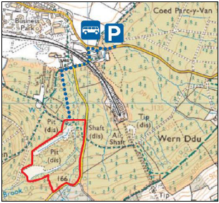 Access: There is no parking at the Clay Pit itself so access to the site is a five minutes’ walk from the Coed Park y Van car park (ST:172-864). The clay pit entrance is at (ST:168-863) where access south on a well-defined access path leads to the clay pit site outlined in red.