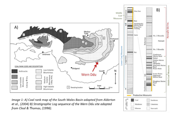 The site of the Wern Ddu claypits located on the southeastern edge of the South Wales Basin (c. 2300 km2) has been recognised for its ability to aid the interpretation of a late Carboniferous (Silesian) coal-bearing sequence spanning 312-308Ma (Duckmantian [Westphalian B] – Bolsovian [Westphalian C]). Lithostratigraphically the exposed outcrops (containing 10 coal seams) at this site belong to the middle-upper part of the South Wales Coal Measures Group and the base of the Warwickshire Group (Pennant Sandstone Formation). Wern Ddu is only one of two locations where the famed “black gold” (coal) mined in the Rhondda Valley comes to the surface and can be accessed.