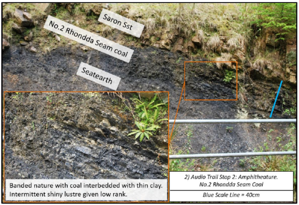 Stop two on the clay pits audio trail is an excavated amphitheatre with good access and an accompanying information board. The location shows the pits youngest coal seam, the No.2 Rhondda coal seam with the overlying Saron Sandstone. The beds are seen dipping 25° towards the NW in accordance with the orientation of the basin’s synclinal axis. There is a sharp contact between the Saron Sandstone and the No.2 Rhondda coal seam representing a sharp influx of coarse alluvial-dominated immature material from the advancing southern thrusted Variscan front.