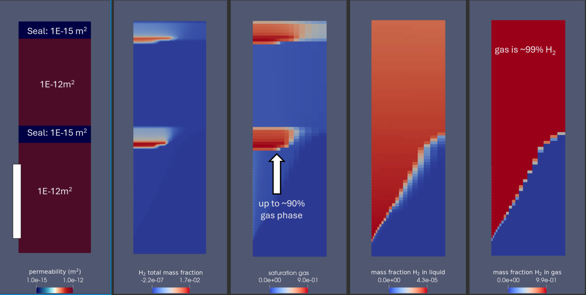 Video 1. Box model showing the migration and trapping of hydrogen (H2) for the setup, boundary conditions and parameterization shown in Figure 2. The model runs over a 10 yr period, showing (from left to right): permeability (constant); total H2 mass fraction (gas phase plus H2 dissolved in the water); capillary pressure (pressure of the non-wetting phase minus the pressure of the wetting phase), with the velocities of the wetting phase; gas saturation (total gas ratio to porosity) with the velocities of the gas (arrow size reduced by a factor of 3 relative to the water velocities); liquid relative permeability; and gas relative permeability (ratio of effective permeability of a particular fluid at a particular saturation to absolute permeability of that fluid at total saturation).