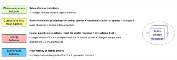Geochemical modelling implies, first, the conceptualisation of the system or process of interest in a useful way (Bethke, 2022). An example relevant for CCS could be assessing how geochemical interactions between the CO2 plume and the rock/sediments drive porosity and permeability changes in a reservoir of variable lithologies. The system includes one or more phases (solid, liquid, gas, supercritical) and species (molecular entities that exist within a phase). It must remain in equilibrium throughout the calculations, i.e., mass, energy and momentum must be preserved within the system (Figure 1).